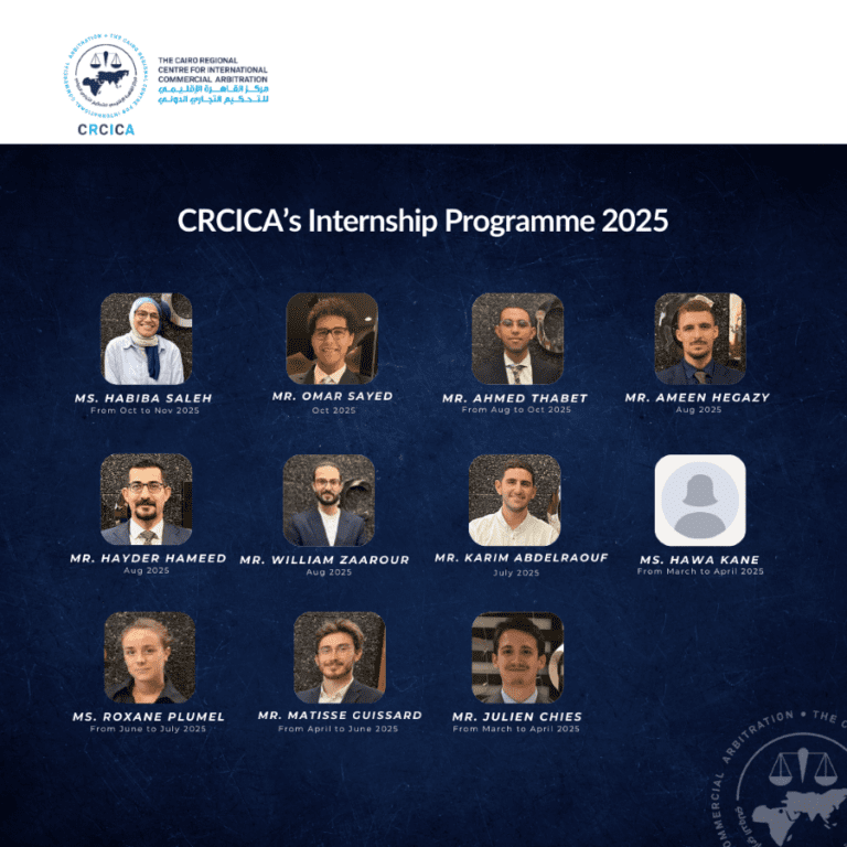 مع اقتراب نهاية العام، نود أن نعرب عن خالص امتناننا لجميع الكوادر الموهوبة التي انضمت إلى برنامج التدريب لدى مركز القاهرة الإقليمي للتحكيم التجاري الدولي لعام 2025. لقد شهد المركز هذا العام حيوية ملموسة بفضل مجموعة متنوعة من المهنيين القانونيين الواعدين الذين قدموا رؤى متجددة، وتفانياً كبيراً، وشغفاً مشتركاً بالتحكيم الدولي. إن مساهماتهم كانت ذات قيمة بالغة في عملياتنا اليومية ومبادراتنا البحثية، وقد كان من دواعي سرورنا أن نشهد تطورهم المهني عن كثب. نحن فخورون للغاية بإنجازاتهم، ونجدد التزامنا برعاية الجيل القادم من خبراء الوسائل البديلة لتسوية المنازعات (ADR).