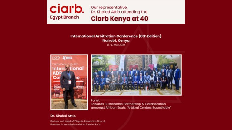 Egypt Branch representative, Dr. Khaled Attia Partner and Head of Dispute Resolution Nour & Partners in association with Al Tamimi & Company attending Chartered Institute of Arbitrators Kenya Branch Kenya at 40, the International Arbitration Conference (8th Edition) Nairobi, Kenya, Celebrating 40 years of Excellence in ADR, 15 -17 May 2024.
