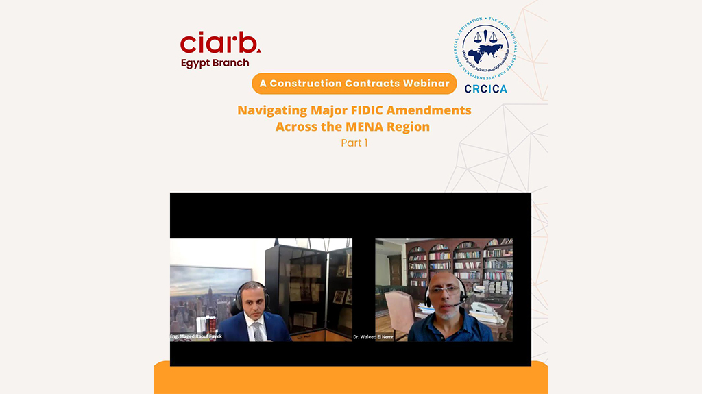 Webinar took place on August 7,2024, co-organized with The Cairo Regional Centre for International Commercial Arbitration (CRCICA), which is the first of a series of events aimed to address these critical amendments. Eng. Maged Raouf Fayek, Contracts & Claims Director, Head Office, Contracting & Construction Enterprises Limited at (CCE), Saudi Arabia discussed his research on this topic on numerous FIDIC contracts in MENA, while Dr. Waleed El Nemr, Vice Chair Ciarb Egypt Branch, moderated.